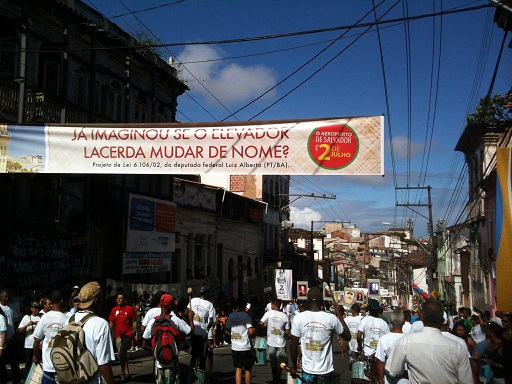 Autor do projeto de lei que altera o nome do Aeroporto Internacional Deputado Luis Eduardo Magalhães para 2 de Julho, o deputado federal Luiz Alberto (PT) distribuiu panfletos e afixou faixas ao longo do trajeto do cortejo em homenagem aos heróis da Independência do Brasil na Bahia, divulgando sua iniciativa, que agora conta com o apoio explícito do governador Jaques Wagner (PT). “Já pensou se nossos cartões postais mudassem de nome?”. A pergunta é o mote da campanha que Luiz Alberto botou nas ruas de Salvador no dia de ontem, classificando como um “absurdo” o fato de o nome do Aeroporto, originalmente 2 de Julho, ter sido mudado para homenagear a memória do filho do ex-senador ACM, o ex-deputado Luis Eduardo Magalhães, morto prematuramente.